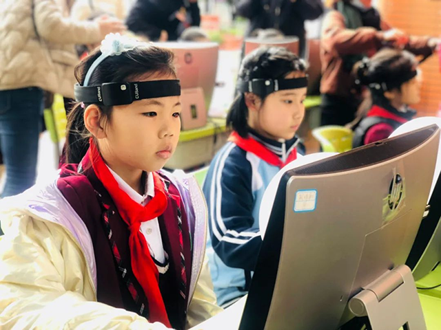 同学们在“大脑360”认知能力测训系统上,使用脑波灯训练注意力