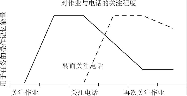 上图表明了下面谈到的这种过程,图中实线代表用来完成一份课外作业所需的操作记忆能量,虚线代表接一次电话所需的能量。例如,高中生杰里米正在做一份历史作业,把注意力放在理解“二战”主要原因上刚刚花了10分钟,此时他脑中的思维区正在冥思苦想,大部分操作记忆的能量用在处理有关信息上。突然,电话铃响了,是女朋友唐娜打来的。当他接电话时,脑中一定不再去琢磨有关的历史知识,而是回想起接听电话的步骤。杰里米花了6分钟与唐娜交谈,这段时间内杰里米的操作记忆所处理的“二战”知识就开始隐退,由通话内容取而代之(操作记忆的能量有限)。当杰里米再做作业时,就差不多要从头再来了。他以为既然能记起做作业的头绪,有关的所有信息就还在操作记忆之中,其实大部分已经荡然无存了,至此他或许会一脸茫然地喃喃自语:“哎呀,我到底做到哪儿了?”这就是完成任务时切换任务必须付出的代价。有研究表明,一个人在完成任务时被打断,需要多花50%的时间来完成任务,而且多犯50%的错误。