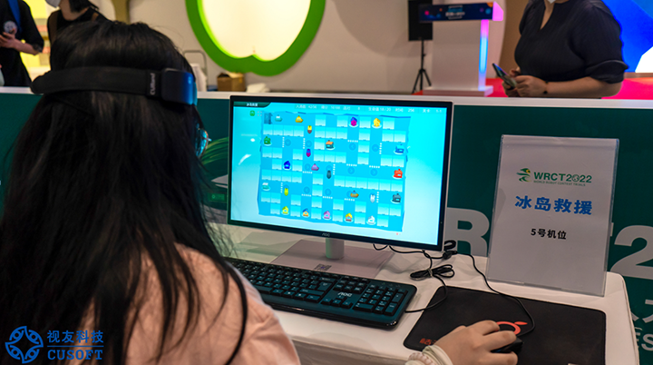 本次赛事中青少年脑机接口项目是基于视友科技研发的“冰岛救援”项目:选手需要在规定时间内,对屏幕中那些错综复杂的冰道中,不断出现且颜色各异的小船进行快速甄别,再通过鼠标点击栅栏,改变小船航道,使小船达到对应颜色的船坞得到相应分数,如一旦选择错误、时间分配不当都将减少得分。