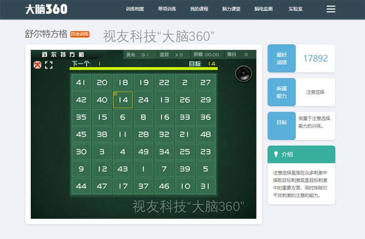 新智注意力“大脑360”选择性注意训练项目——舒尔特方格