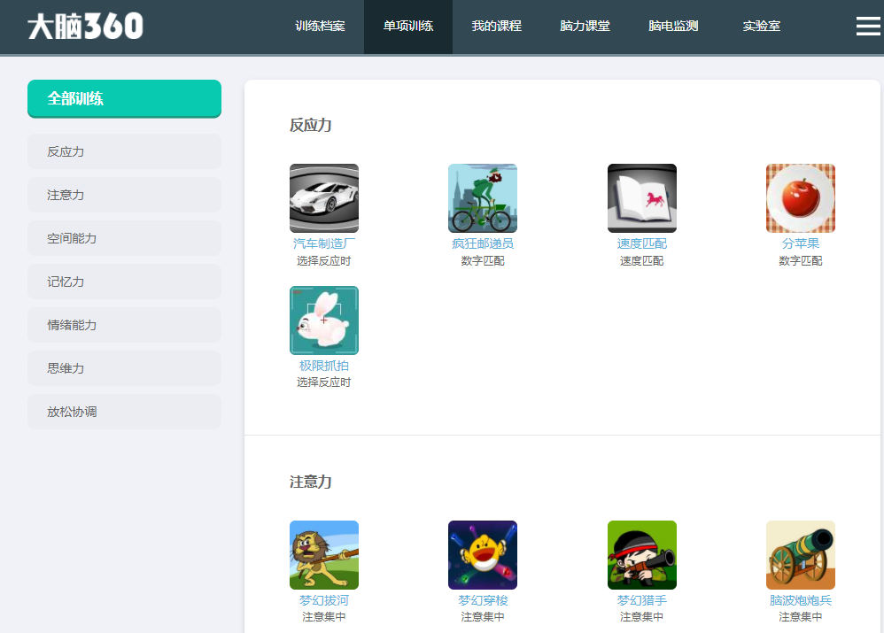 大脑360里面一共有50多款训练项目,针对每一种能力训练的方式都力争多种多样化,只有这样才能建立起多重背景下、运用多种智力、用不同的媒介激发多种情绪反应,学习效果会更好,也更利于我们神经元之间建立稳固的神经通路。