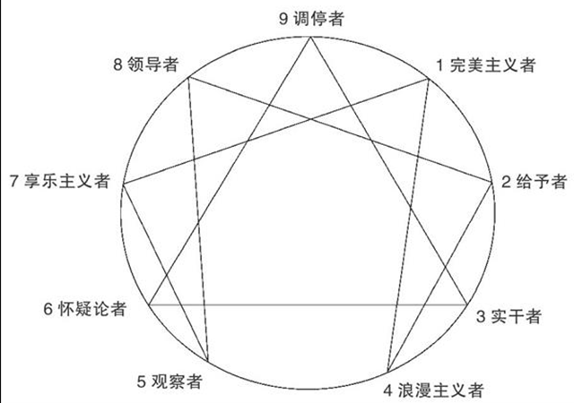 如图所示,九型人格将人按照不同的气质类型分成了完美型、给予型、实干型、浪漫型、观察型、怀疑型、享乐型、领导型和调停型九个基本人格类型,每个人都必然属于其中一型,且稳定不会更改。